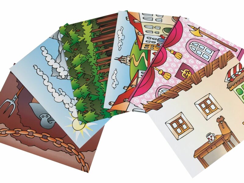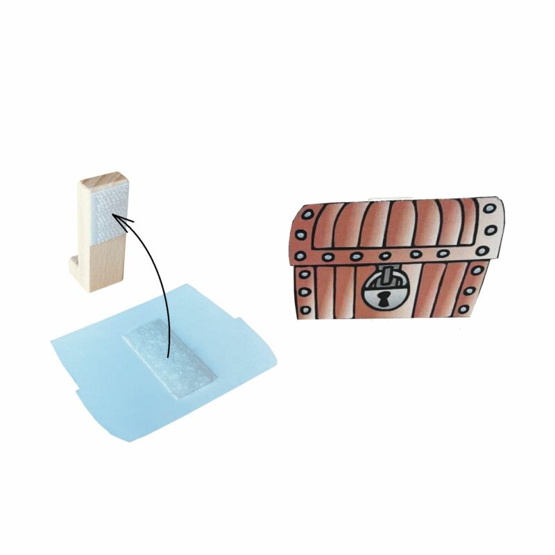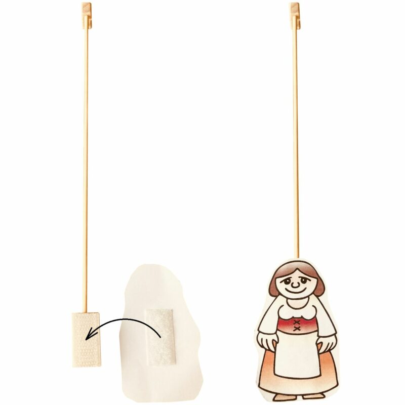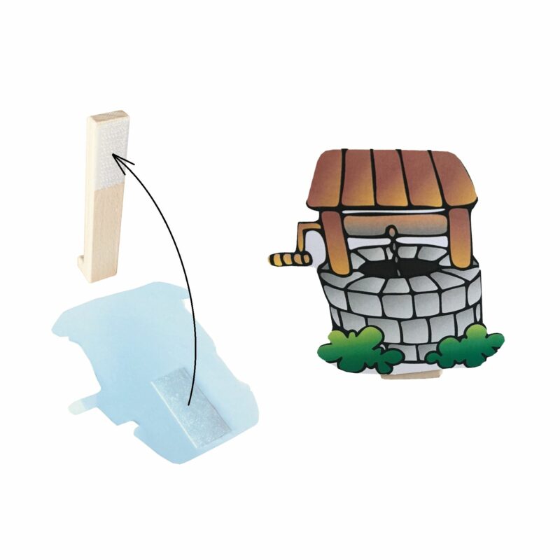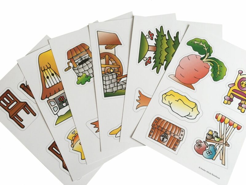 Kompletace: Papírové loutky a kulisy vystřihněte a na zadní stranu nalepte smyčkovou část suchého zipu. Aby se papírové loutky a kulisy při odlepování od držáků nepokrčily, doporučujeme suchý zip před nalepením několikrát opotřebovat. Tím se sníží potřebná síla pro odlepení, což pomůže předejít poškození. Na držáky loutek a kulis nalepte háčkovou část suchého zipu.