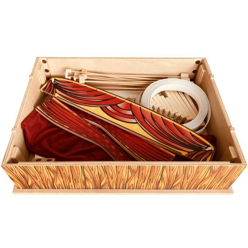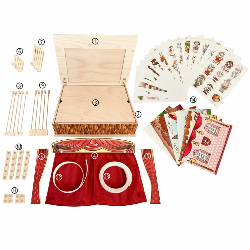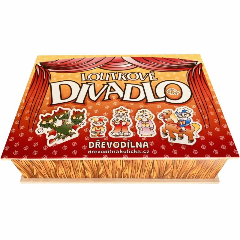 Materiály a bezpečnost: Loutkové divadlo je vyrobeno z kvalitního bukového dřeva, opona je z tmavě červeného sametu. Použité barvy a lak mají atest na dětské hračky. Všechny části jsou pečlivě zabroušeny. Loutky a kulisy jsou vytištěny na tvrdém papíře s kresbou od výtvarnice Miluše Řehůřkové.