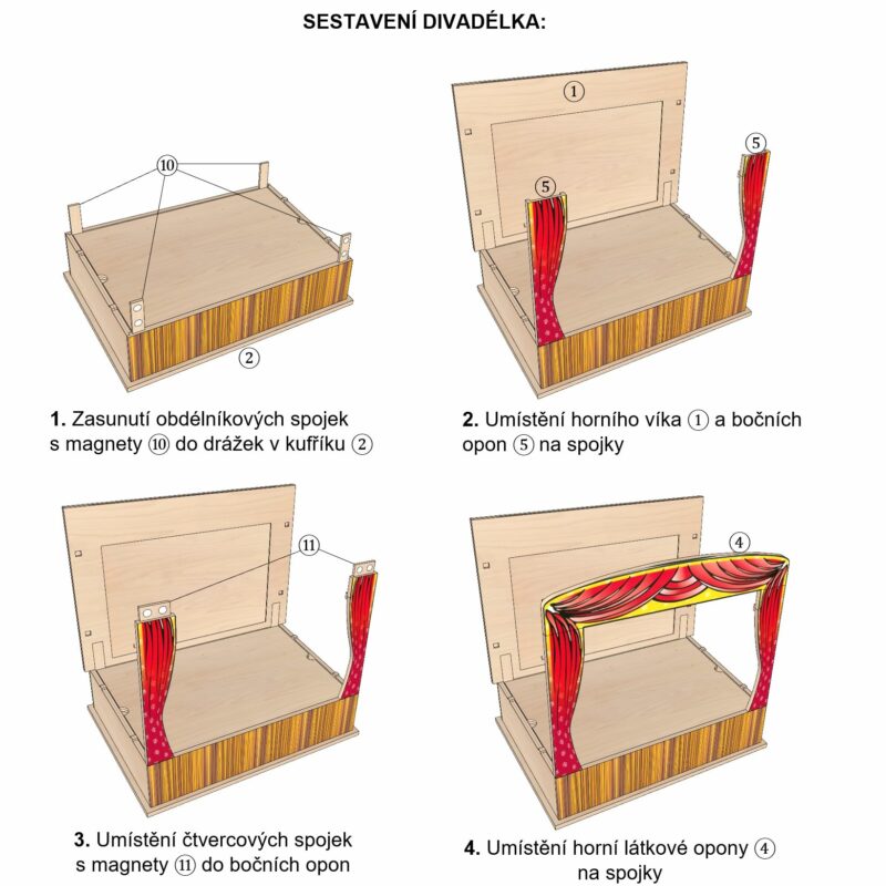Sestavení: Loutkové divadlo snadno sestavíte podle přiloženého návodu ve čtyřech jednoduchých krocích. Jednotlivé části se spojují pomocí magnetů.