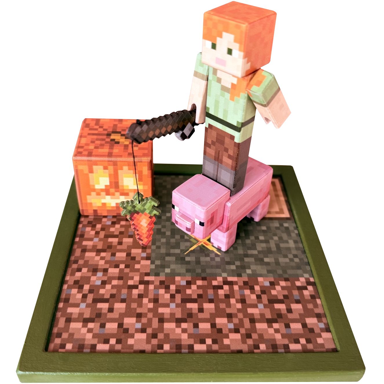 Set dřevěných Minecraft hraček zachycující Alex s prasátkem na procházce. Tento set je sestaven z vybraných prvků zahrnující hrací podložky, malé figurky, nástroje a předměty k figurkám, Minecraft zvířátka a bloky, vše k dispozici také samostatně.