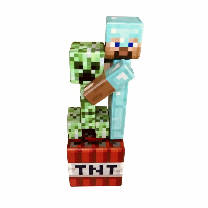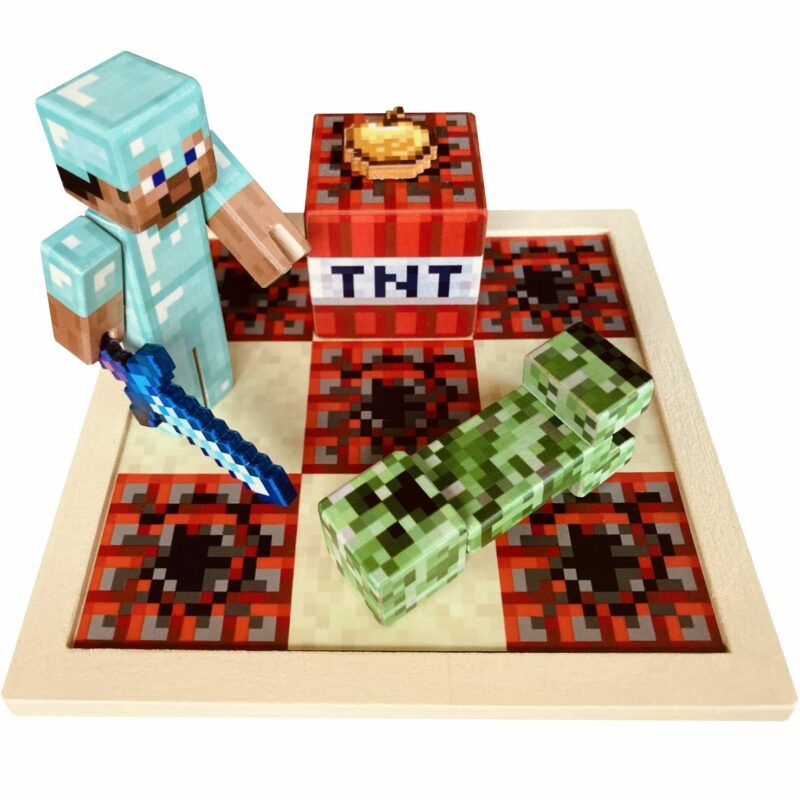 Velikost: Přibližné rozměry jednotlivých prvků – oboustranná hrací podložka 14 x 14 cm, výška figurek 6 cm (creeper) a 8 cm (Steve), blok 4 cm, délka nástroje (očarovaný diamantový meč) 5,5 cm, délka předmětu (zlaté jablko) 2 cm.