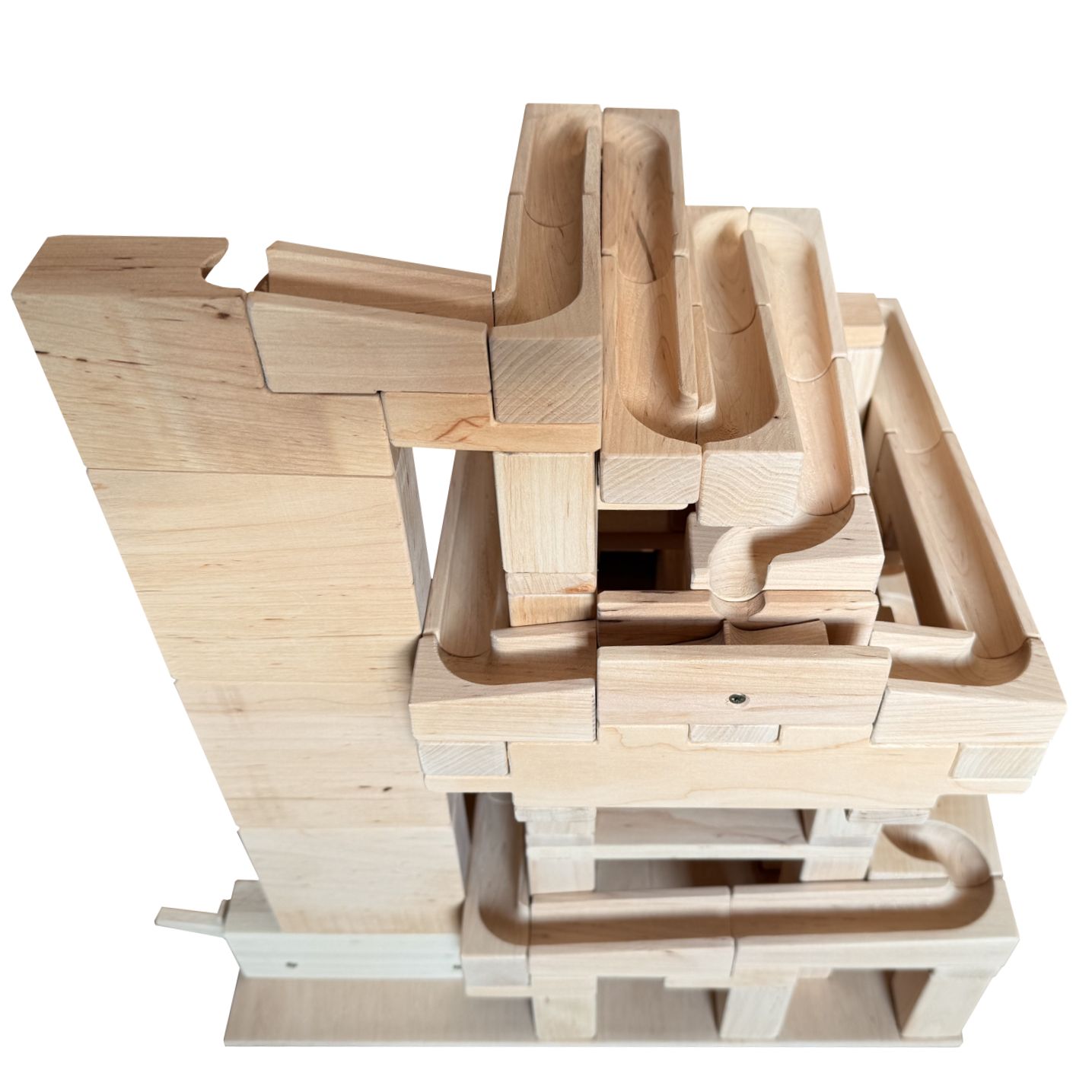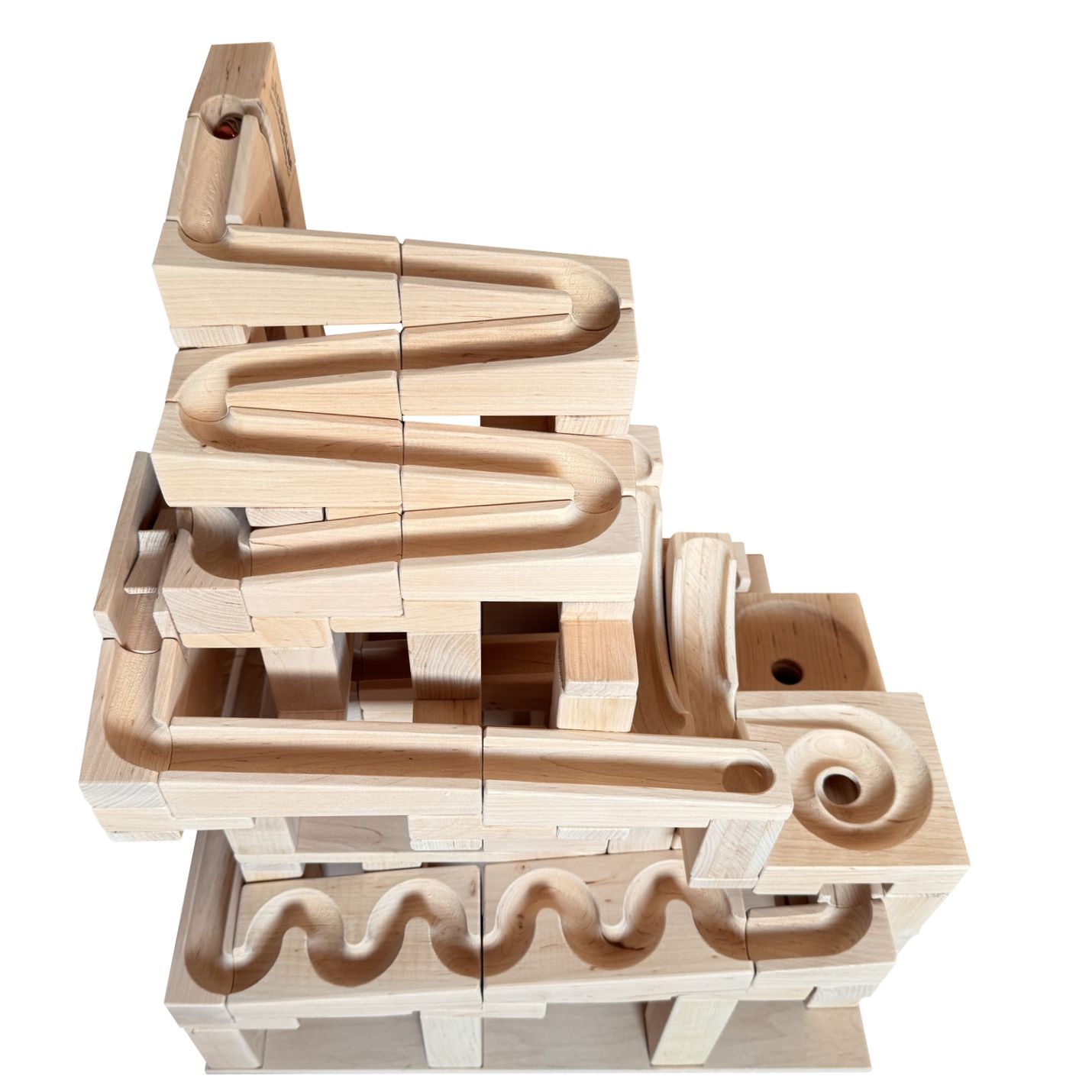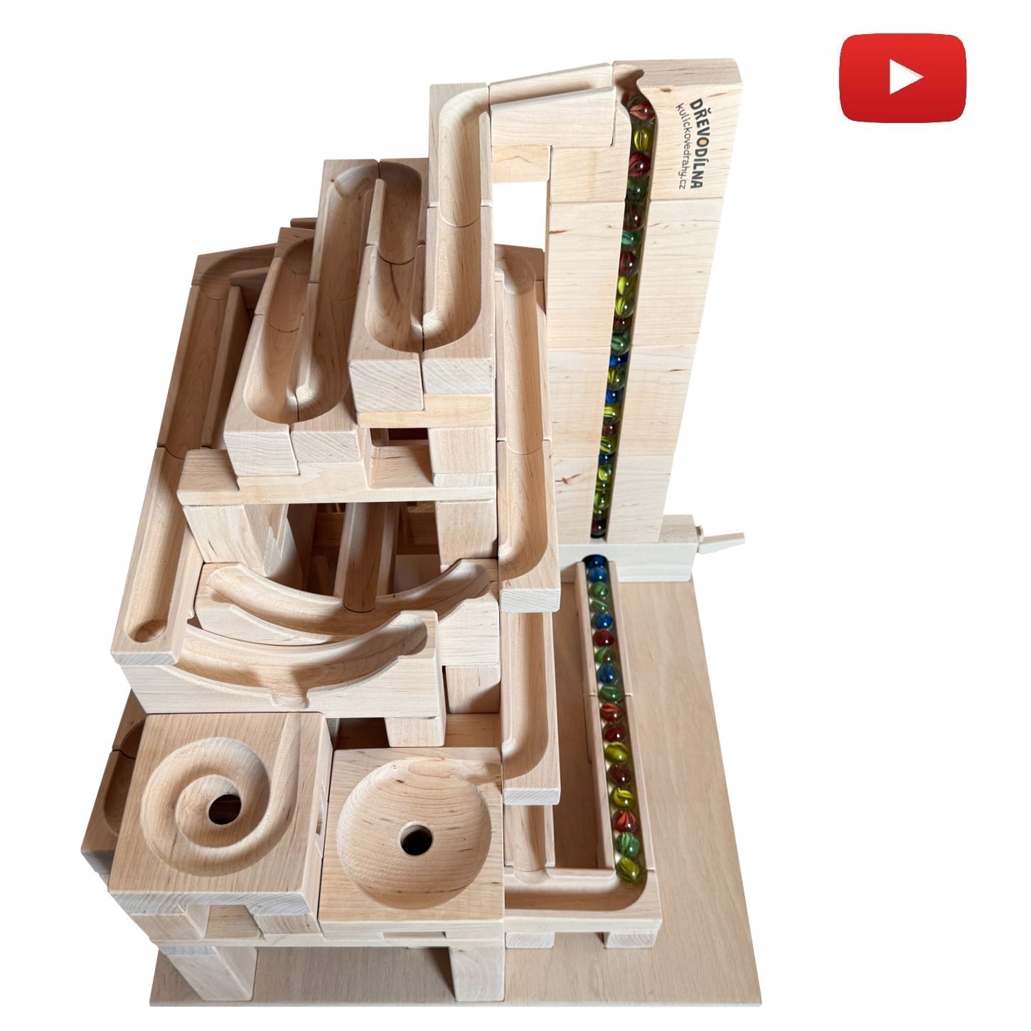 Glued marble machine 3 is made from wood. The individual parts are fixed on the wooden pad. This is a large ball track suitable for larger play spaces (nurseries, children’s playrooms, restaurants, etc.).