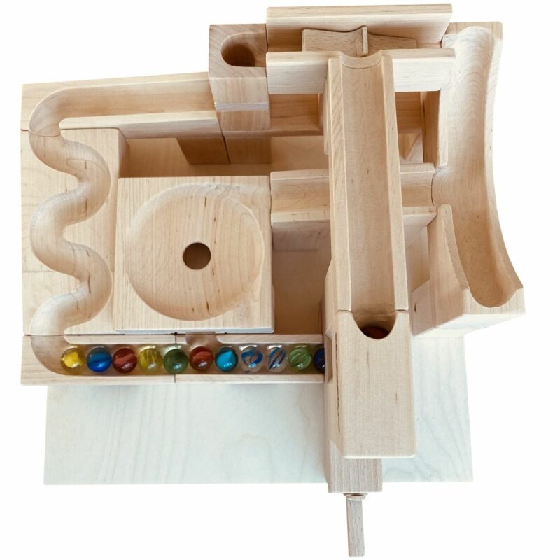 Glued marble machine is made from wood. The individual parts are fixed on the wooden pad. This is a small-sized marble machine for the smallest.